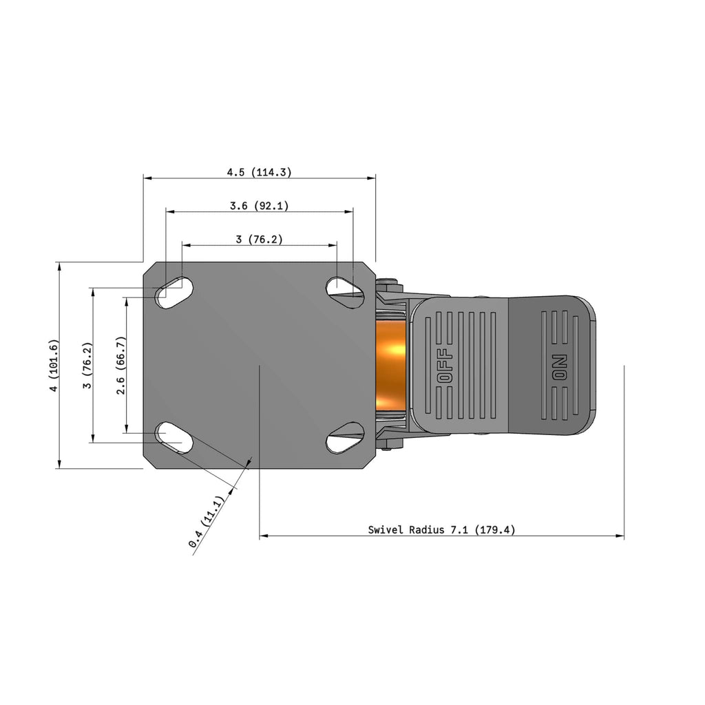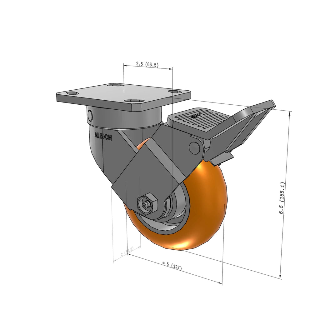 This 5" ergonomic heavy-duty swivel caster is engineered to deliver lasting performance in demanding industrial environments. Featuring an exclusive USA-made kingpinless rig with an extended lead, advanced orange MAX-Efficiency polyurethane wheel, and face brake – it helps reduce operator strain and improve safety when moving heavy carts and equipment.