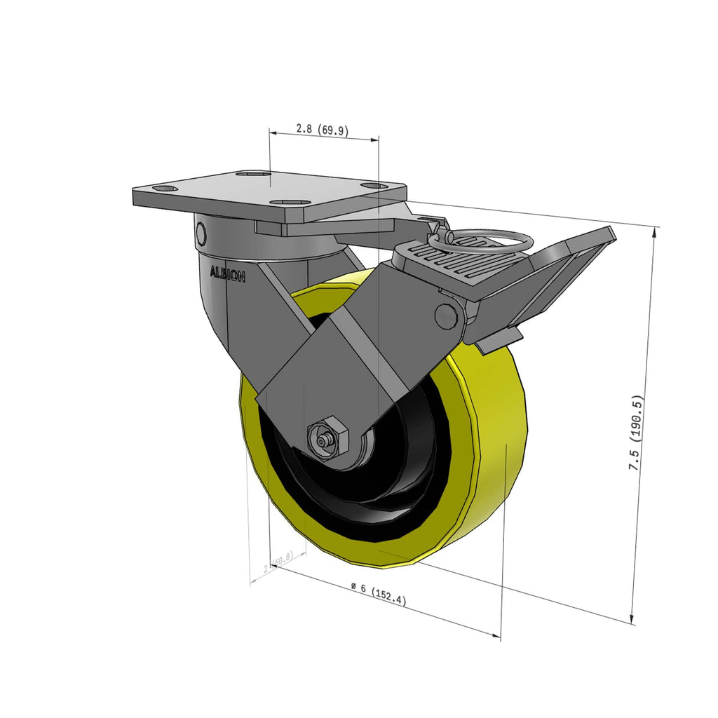 This 6" ergonomic heavy-duty swivel caster is engineered to deliver lasting performance in demanding industrial environments. Featuring an exclusive USA-made kingpinless rig with an extended lead, high-capacity thick polyurethane-on-iron wheel, face brake, and swivel lock – it helps reduce operator strain and improve safety when moving heavy carts and equipment.