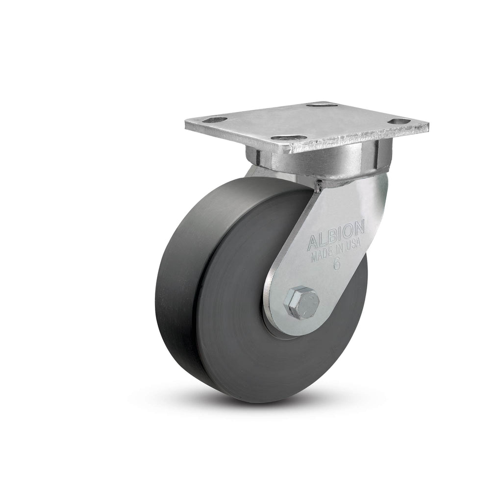This 6" ergonomic heavy-duty swivel caster is engineered to deliver lasting performance in demanding industrial environments. Featuring an exclusive USA-made kingpinless rig with an extended lead and high-impact Nylatron NX wheel – it helps reduce operator strain and improve safety when moving heavy carts and equipment.