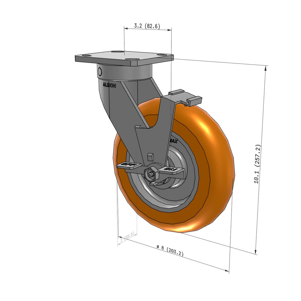 8"x2" Kingpinless Ergonomic Caster – USA Rig, MAX-Efficiency Orange Poly Wheel, Side Brake