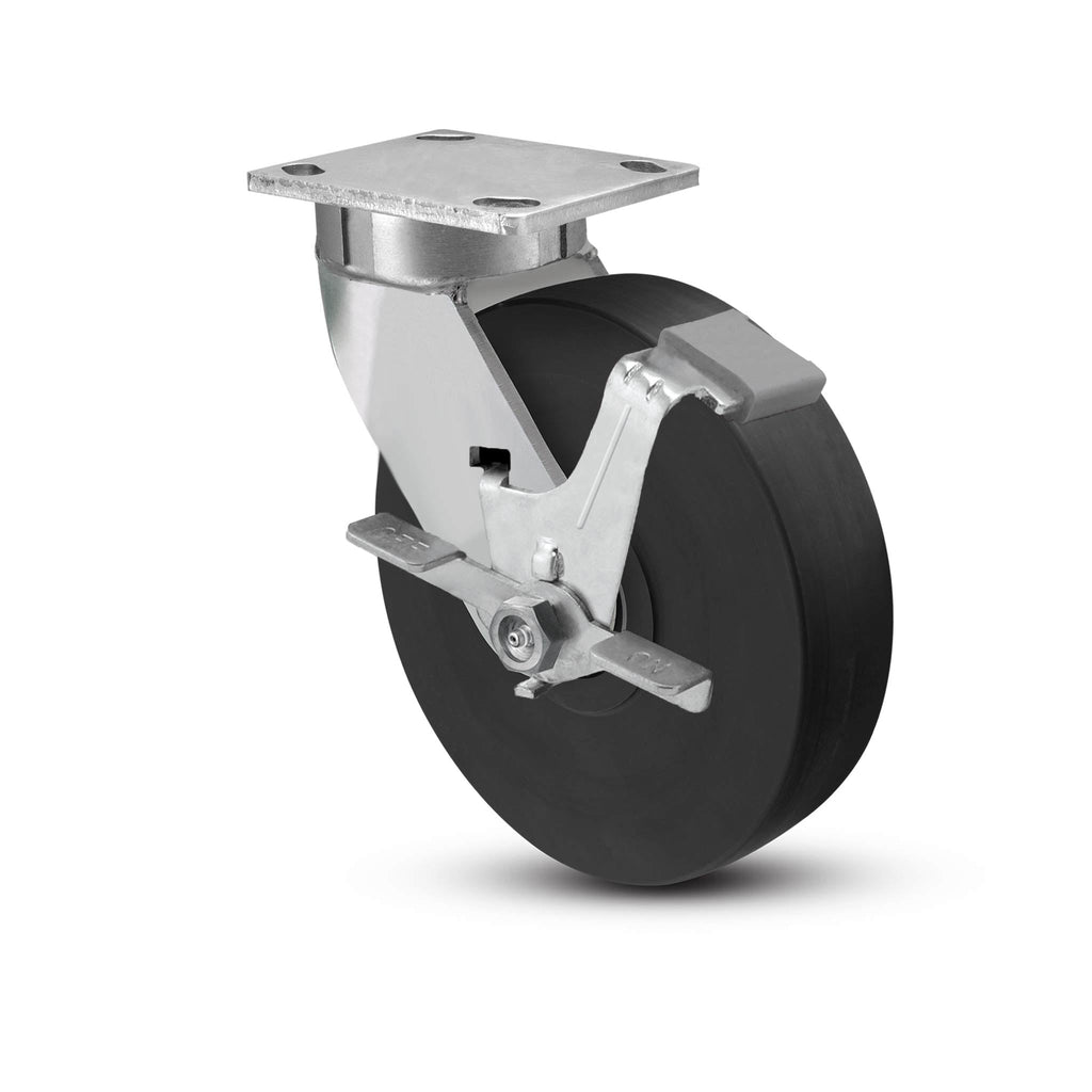 This 8" ergonomic heavy-duty swivel caster is engineered to deliver lasting performance in demanding industrial environments. Featuring an exclusive USA-made kingpinless rig with an extended lead, high-impact Nylatron NX wheel, and side activated brake – it helps reduce operator strain and improve safety when moving heavy carts and equipment.